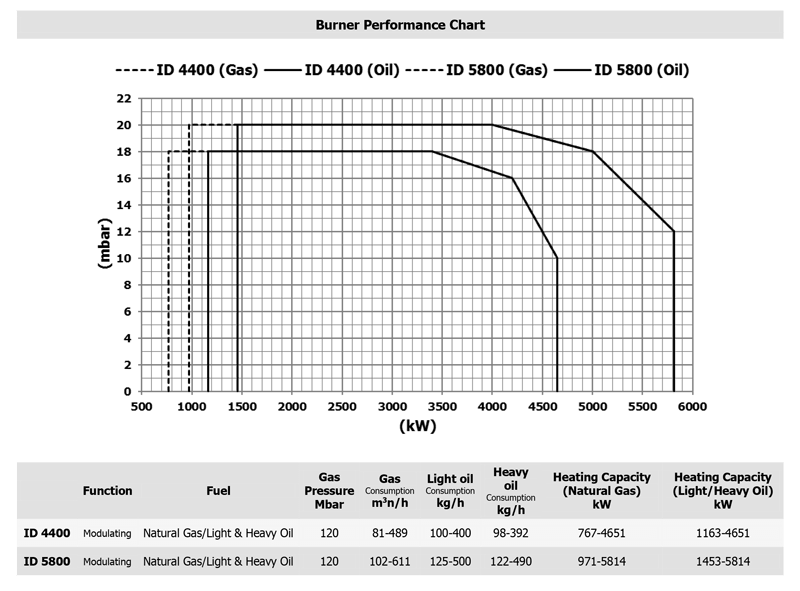 Fuel: Natural Gas/Light & Heavy Oil. Gas Pressure 120- mbar. Gas consumption 81-611 m3n/h. Light Oil consumption 100-500 kg/h. Heavy Oil consumption 98-490 kg/h. Heating capacity (Natural Gas) from 767-5814 kW. Heating capacity (Light/Heavy Oil) from 1163-5814 kW.