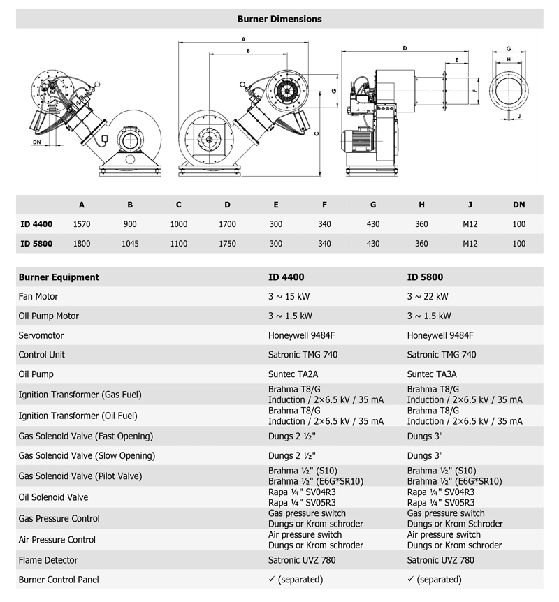 Fuel: Natural Gas/Light & Heavy Oil. Gas Pressure 120- mbar. Gas consumption 81-489 m3n/h. Light Oil consumption 100-400 kg/h. Heavy Oil consumption 98-392 kg/h. Heating capacity (Natural Gas) from 767-4651 kW. Heating capacity (Light/Heavy Oil) from 1163-4561 kW.