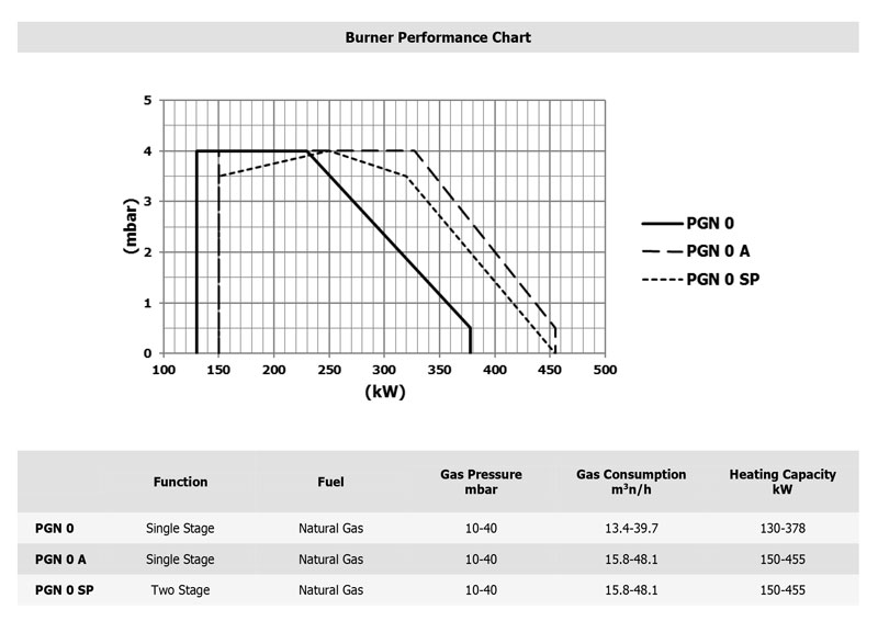 Gas Pressure 10-40 mbar. Gas consumption 15.8-48.1 m3n/h. Heating capacity from 150-455 kW.