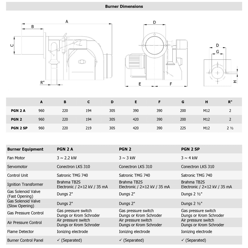 Gas Pressure 40-80 mbar. Gas consumption 52-220 m3n/h. Heating capacity from 493-2093 kW.