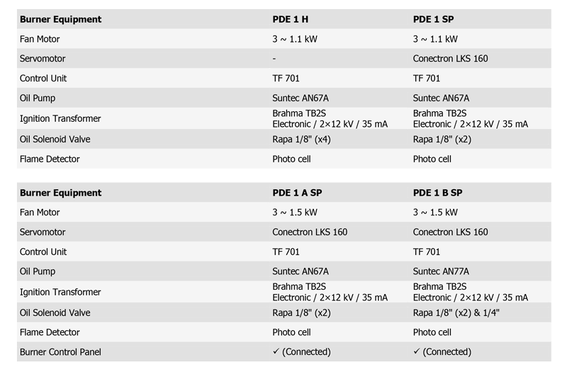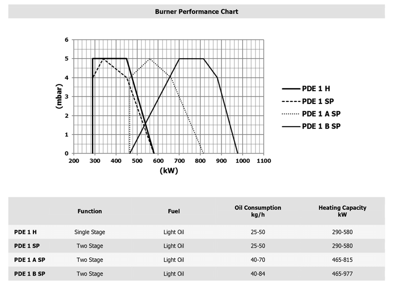 Fuel: Light oil. Oil consumption 25-84 kg/h. Heating capacity from 290-977 kW.