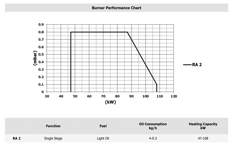 Fuel: Light oil. Oil consumption 4-9.3 kg/h. Heating capacity from 47-108 kW.